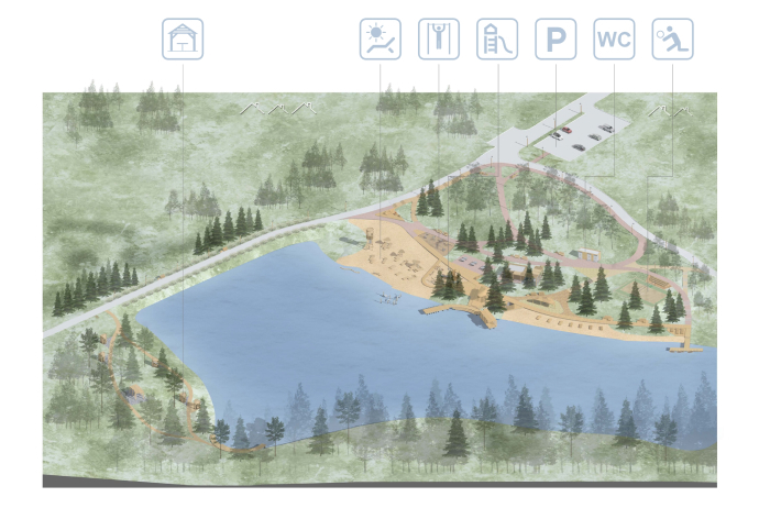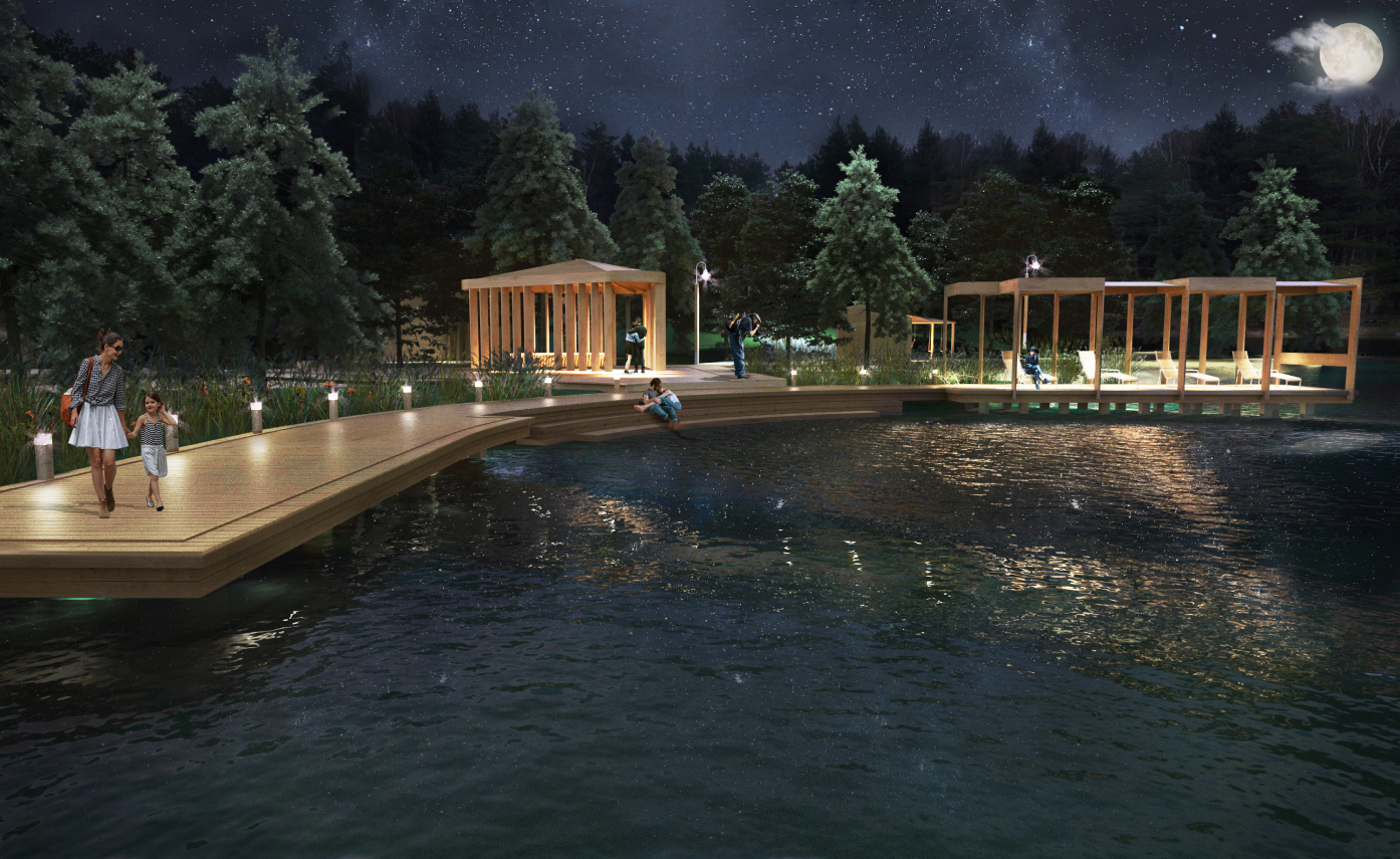 At the heart of the project is the improvement of the recreation area near the dam on the Pugachevskaya street has the idea of creating new relations between man and nature in it. The main goal of working on the concept is to use architectural means to realize the right of every inhabitant of the working settlement Shakhovskaya to a comfortable beach holiday and swimming.
