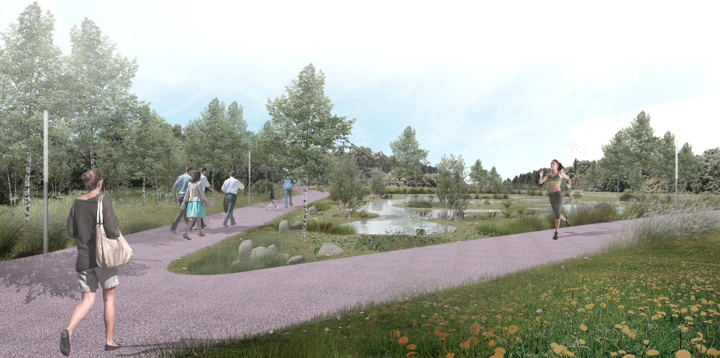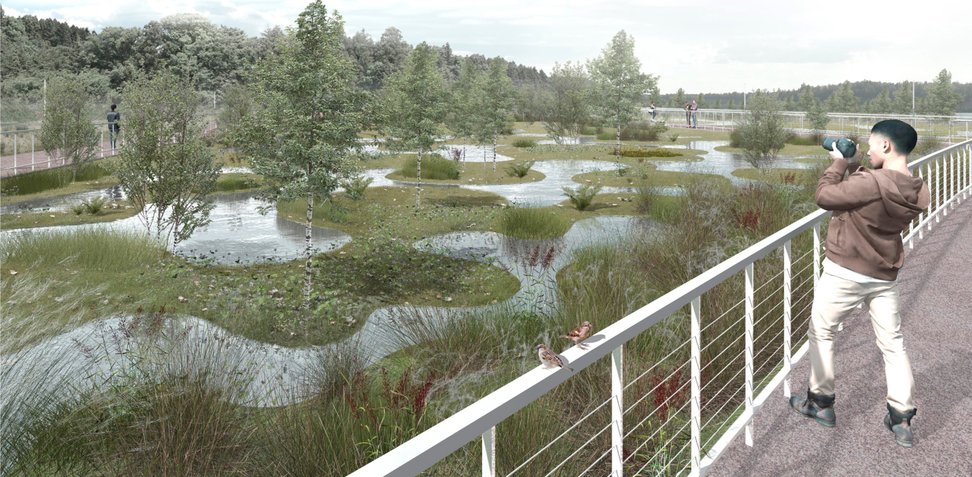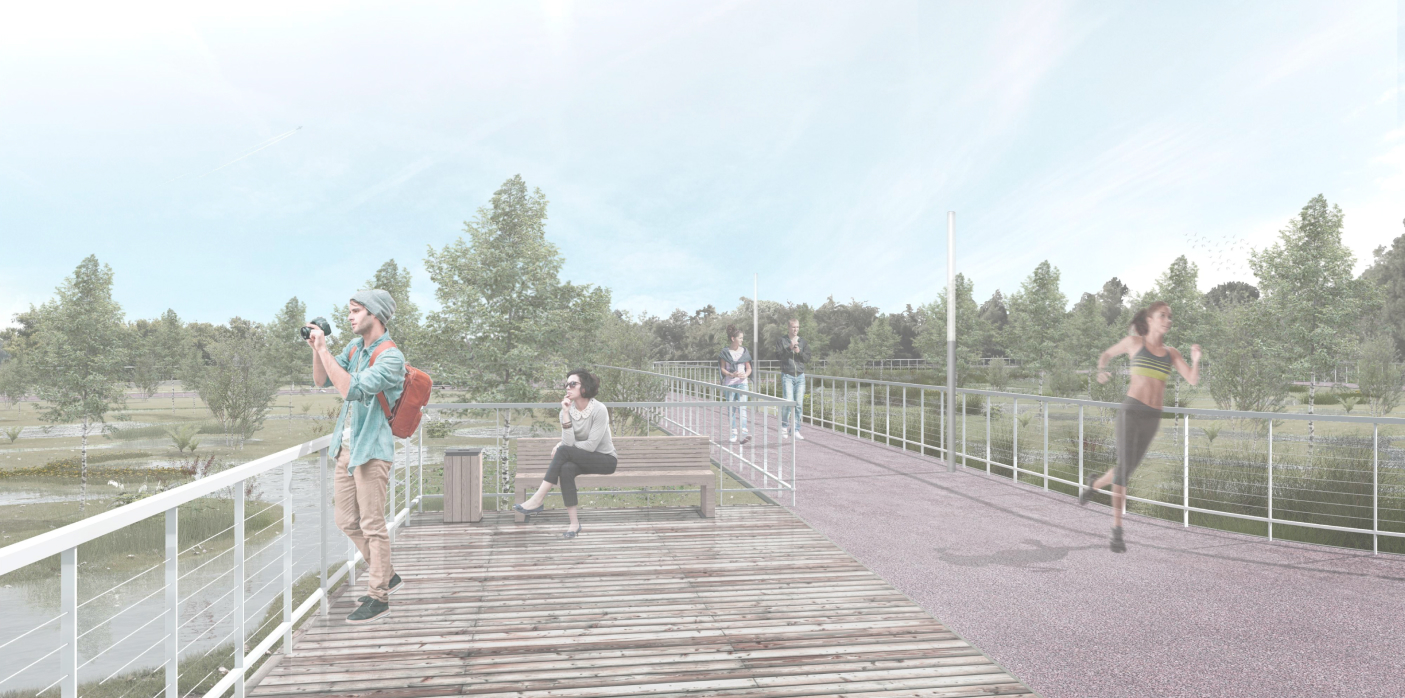 The architectural and planning concept proposes the transformation of the existing space into a new, natural and recreational attraction with a biotope system (“Shakhovskaya's Necklace”) and illuminated islands in a turf swamp (“Islands of Light”).