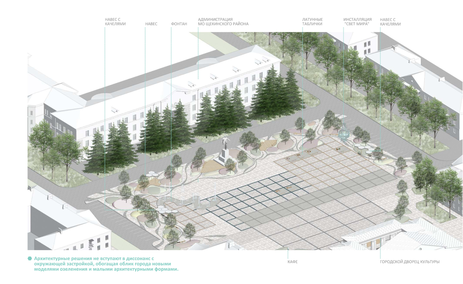 Щёкино – город, в котором сосуществуют активная городская жизнь, промышленное настоящее и природа. Новая архитектурно- планировочная концепция благоустройства центрального парка и главной площади Щёкино раскрывает многогранность города и даёт каждой из его граней новые краски. Проект получил название «Химия с природой» не случайно, ведь в отношении любви часто применяют слово «химия». В основу проекта легла идея выхода природы из парка на главную площадь, которая, с свою очередь, обрела новый образ, отражающий историю города, его настоящее и устремлённость в будущее.