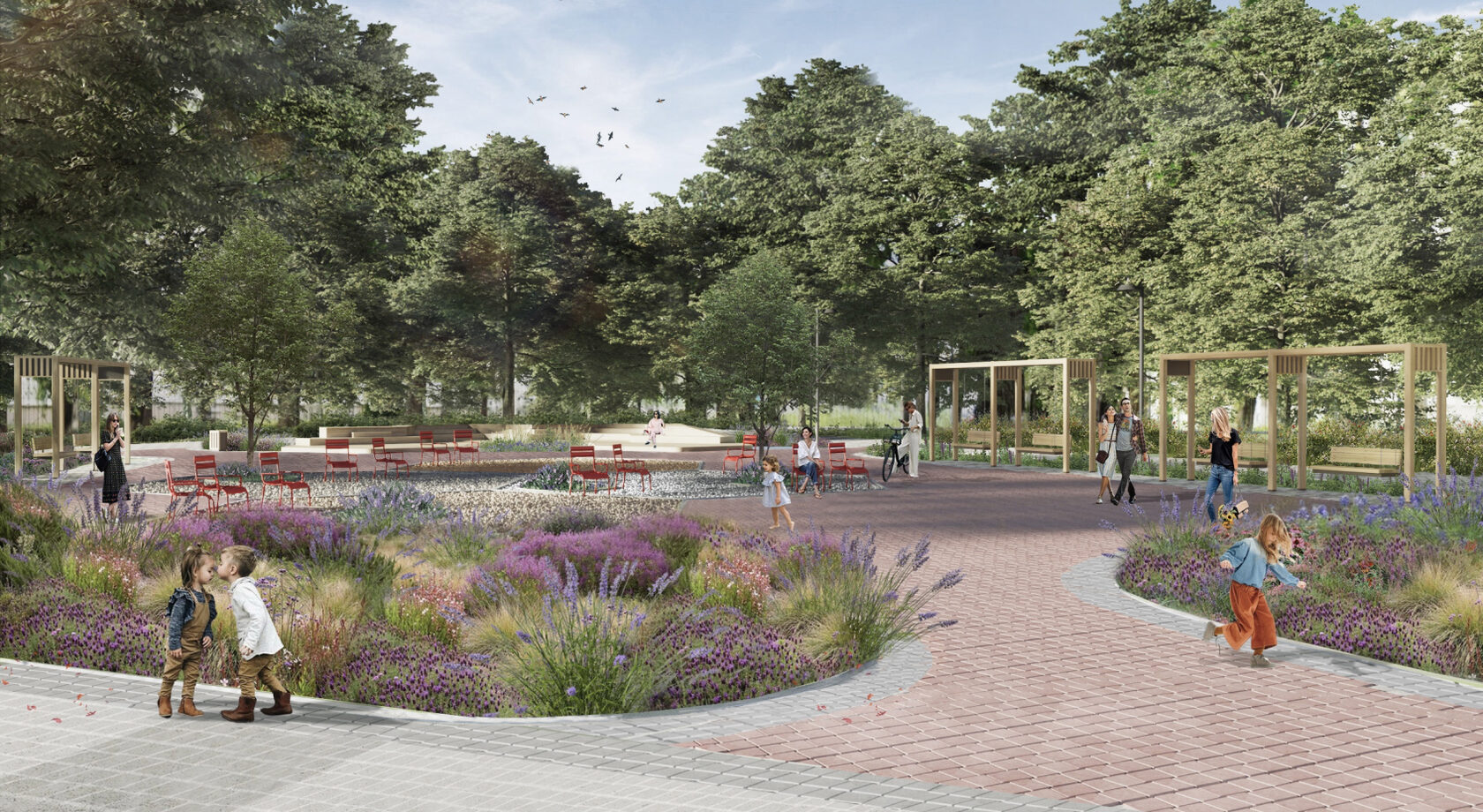 A modern playground with benches, trash cans and lighting will be built in the square, pedestrian paths will be paved and illuminated, small architectural forms will be installed. There will be a recreation area with multi-level benches and park swings, an outdoor toilet for visitors.