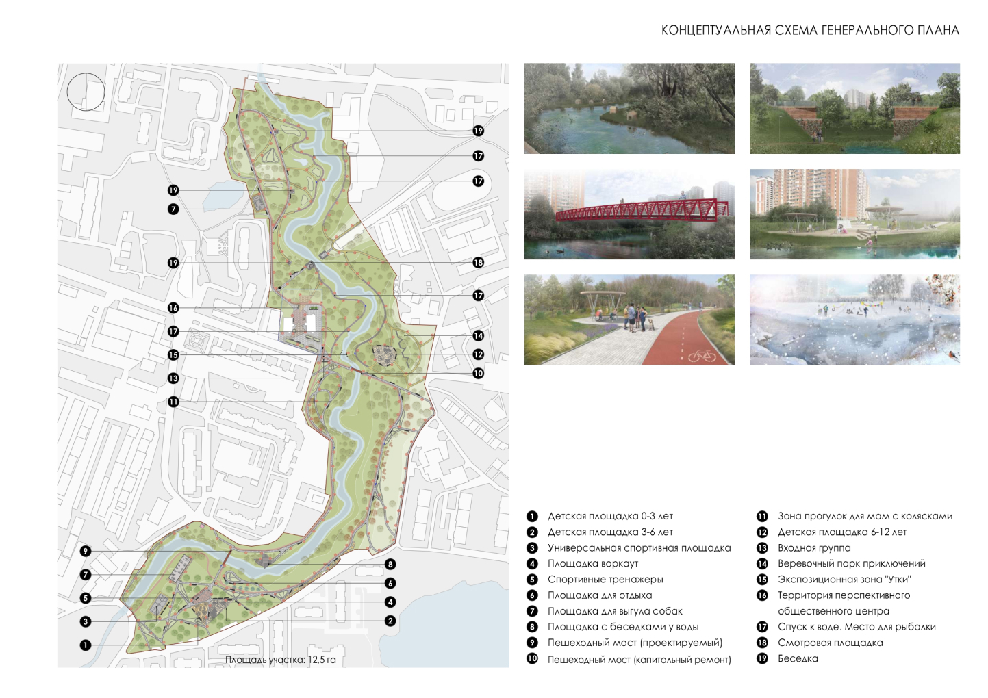 Проектом предлагается создание на благоустраиваемой территории функционального зонирования, направленного на устойчивое развитие территории будущего эко-парка. Оно обеспечивается выделением участков с разной интенсивностью рекреации, формированием безбарьерной, удобной для всех категорий жителей прогулочно-пешеходной сети, снижающей нагрузку на экосистему.